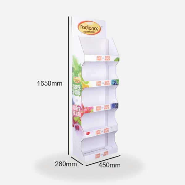 This corrugated floor display is made with one piece of cardboard, very cost effective and useful for snacks and dry fruits, got very high approval from our clients.