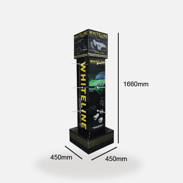 This paper rack display is made for car accessories, the display is with plastic hooks for hanging car accessories products..